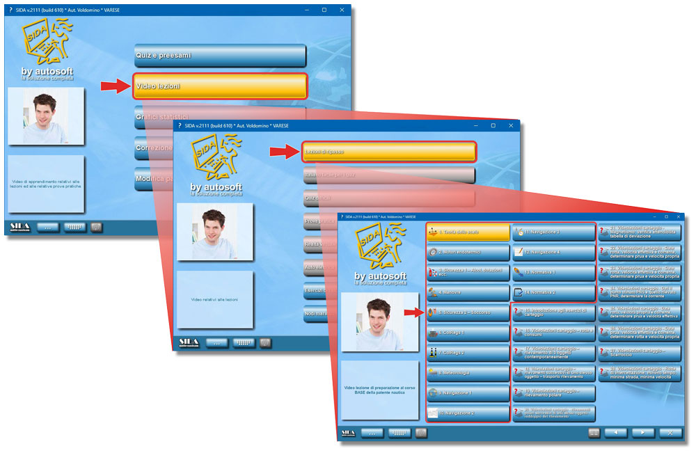 Nel modulo quiz di SIDA, le videolezioni di ripasso patente nautica sono visibili dal candidato che entra con il proprio codice in Video Lezioni - Lezioni di ripasso.